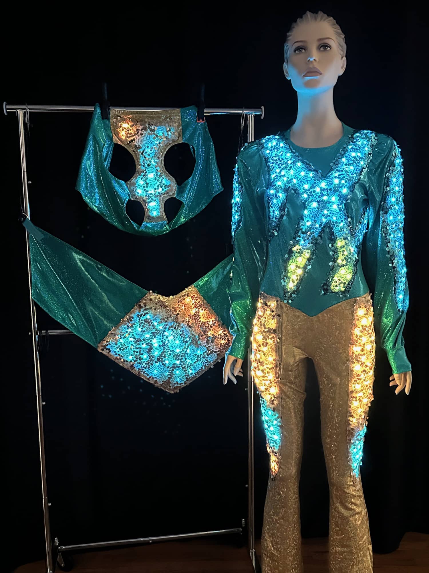 All pieces are illuminated with RGB LED pixels hand-stitched to fabric base layers and covered with sheer sequin fabrics that allow light to pass through while concealing the wiring. The lights are programmed in a variety of animation effects and colors that can be selected before each performance.