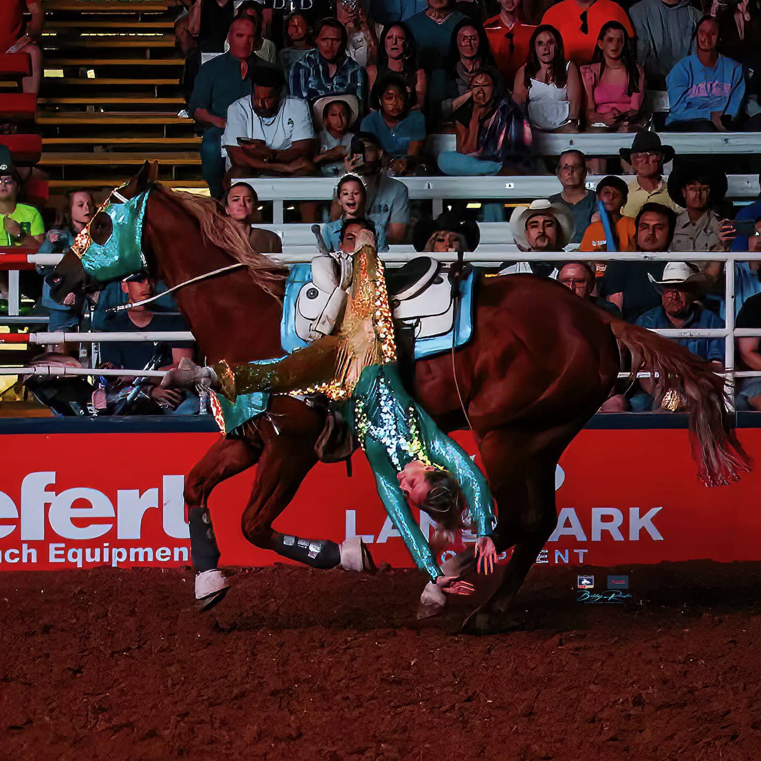 Enlighted was commisioned to light up a bodysuit for trick rider Cortney Clabaugh and matching accessories for her horse. The positions of the lights, controls, and battery packs were carefully selected to optimize durability and to ensure that they do not impede any of her acrobatic movements.