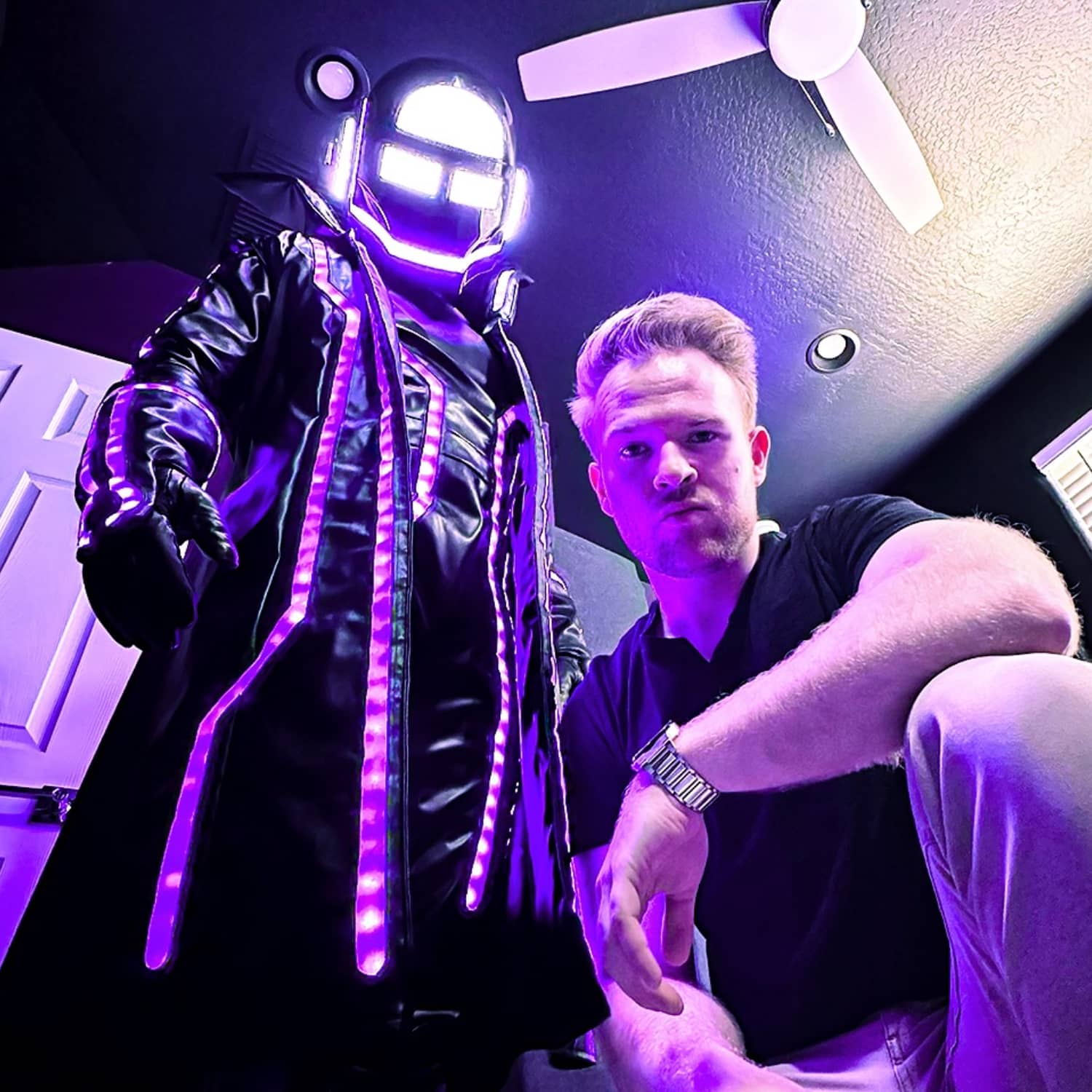DHeusta is a US-based composer and musician who often appears with a masked alter-ego (or possibly sidekick?) wearing a black bodysuit and outer trenchcoat with a high collar. We created lighting for the bodysuit and the outer coat portion of the outfit, which is concentrated in diffused white stripes but mostly illuminated with purple glowing effects.