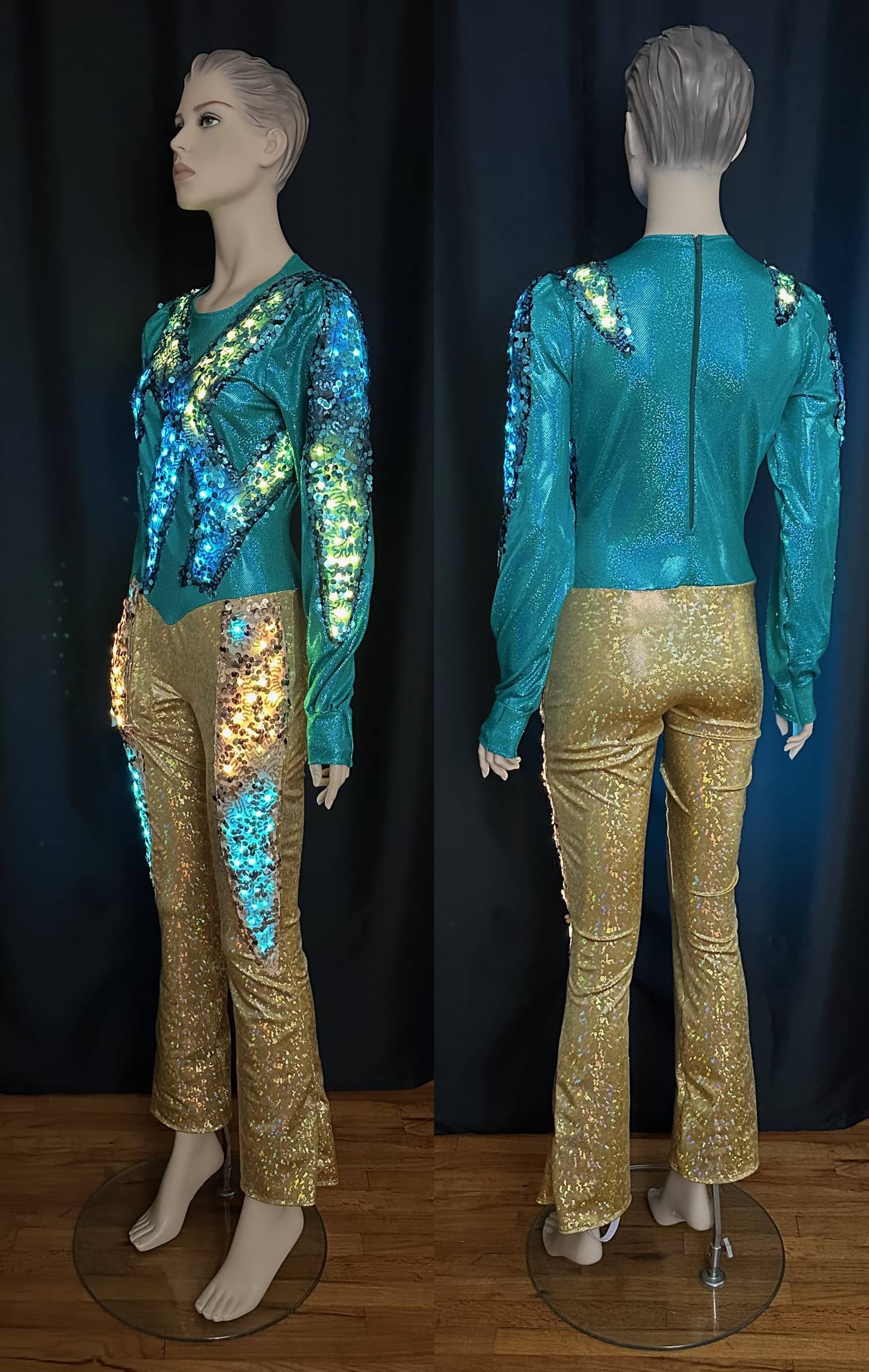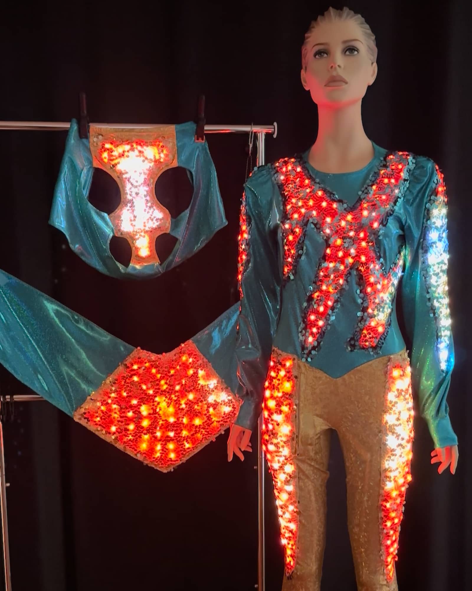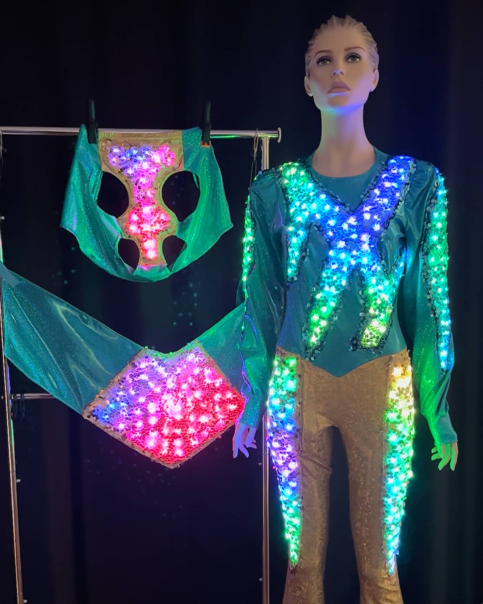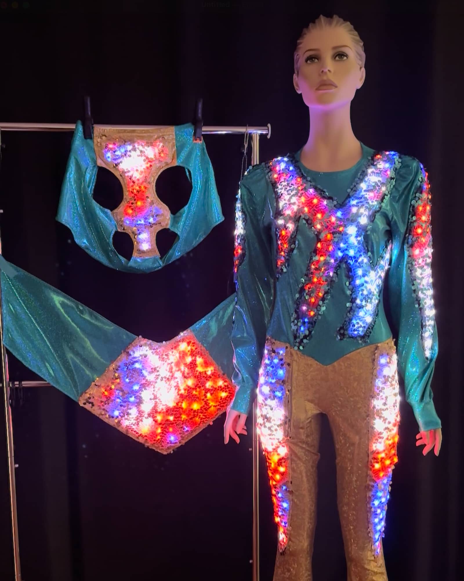 All pieces are illuminated with RGB LED pixels hand-stitched to fabric base layers and covered with sheer sequin fabrics that allow light to pass through while concealing the wiring. The lights are programmed in a variety of animation effects and colors that can be selected before each performance.