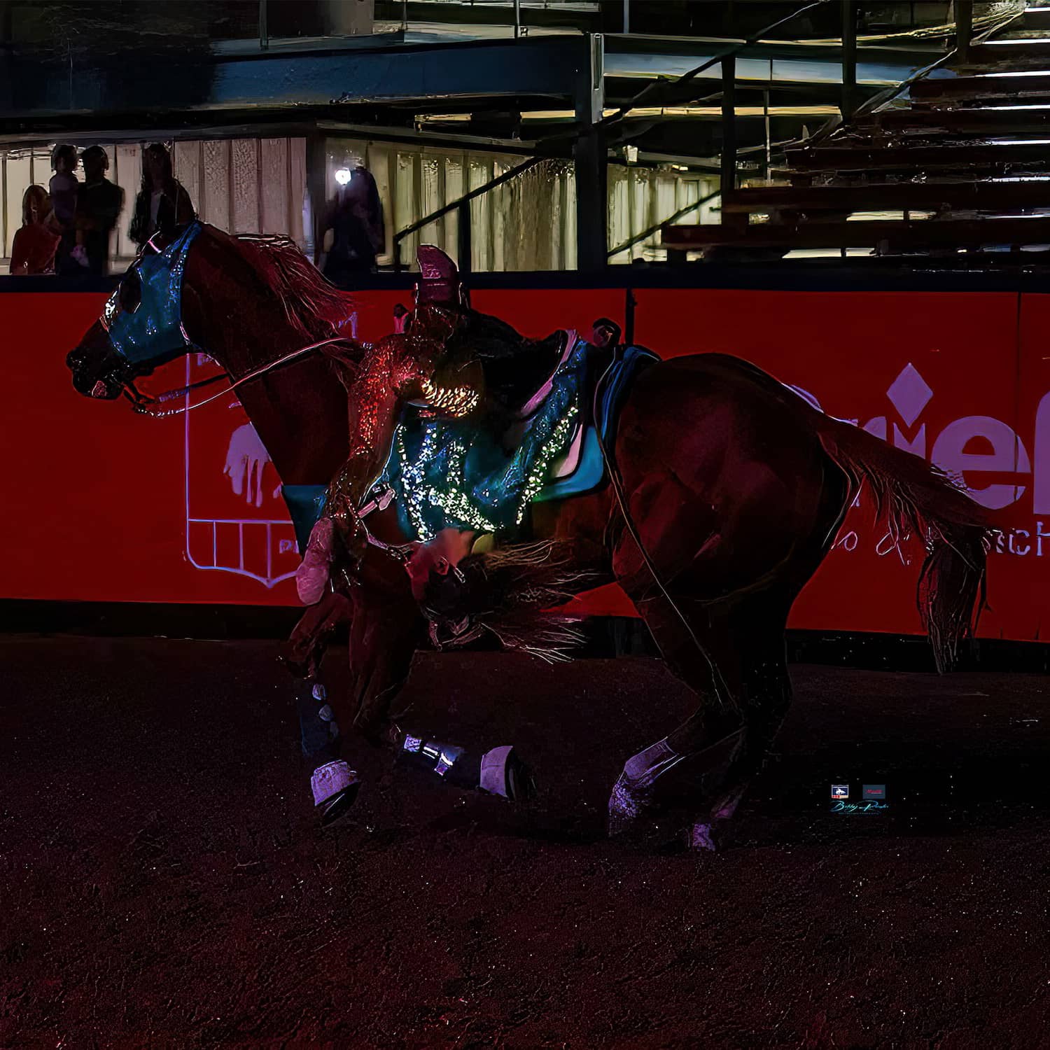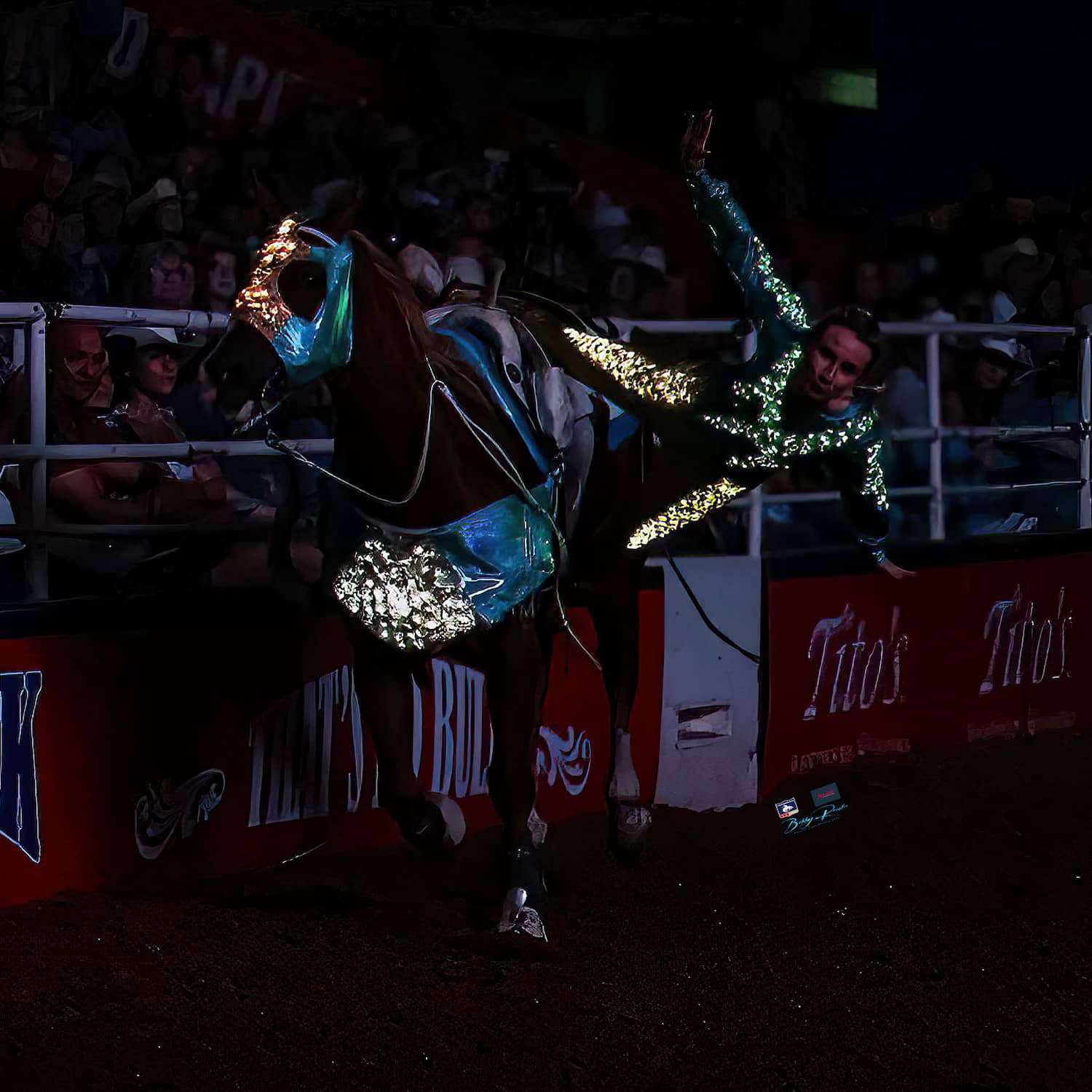 Enlighted was commisioned to light up a bodysuit for trick rider Cortney Clabaugh and matching accessories for her horse. The positions of the lights, controls, and battery packs were carefully selected to optimize durability and to ensure that they do not impede any of her acrobatic movements.