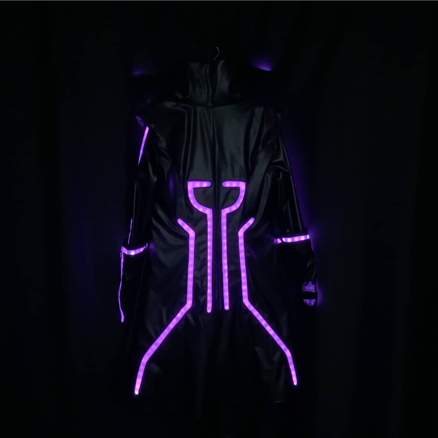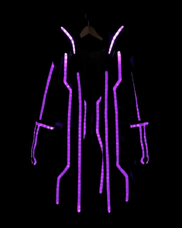 DHeusta is a US-based composer and musician who often appears with a masked alter-ego (or possibly sidekick?) wearing a black bodysuit and outer trenchcoat with a high collar. We created lighting for the bodysuit and the outer coat portion of the outfit, which is concentrated in diffused white stripes but mostly illuminated with purple glowing effects.