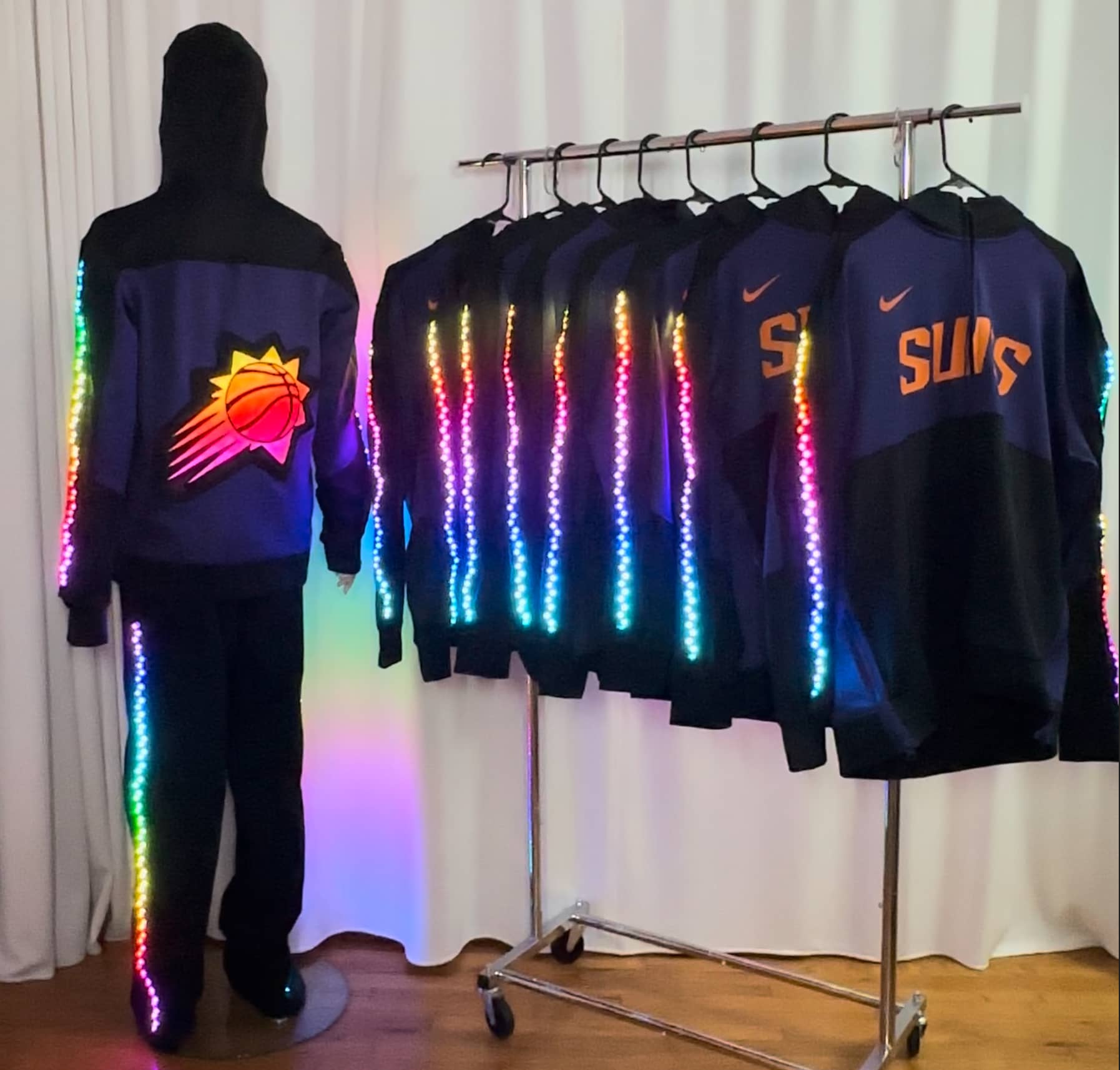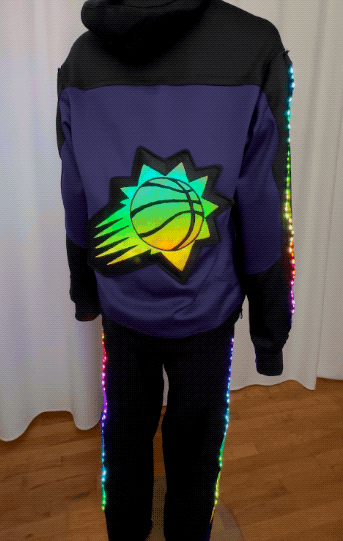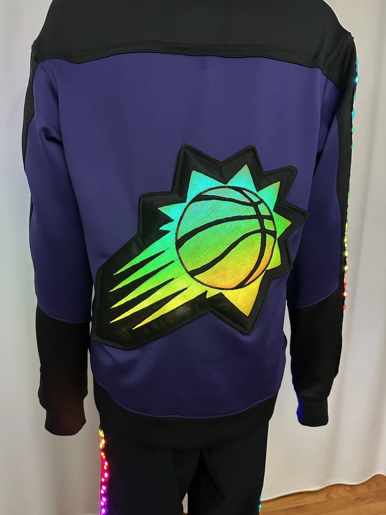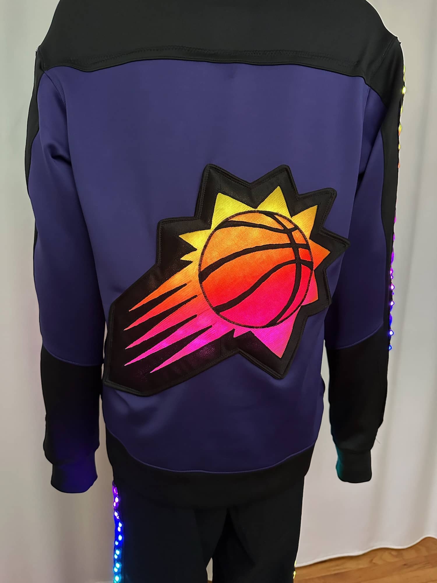 We were commissioned to light up warm up suits for PHX Beats, the drumline that performs at Phoenix Suns NBA home games. We added stripes of lighting along the outer seams of the sleeves and legs, and created an illuminated logo for the back of each jacket.