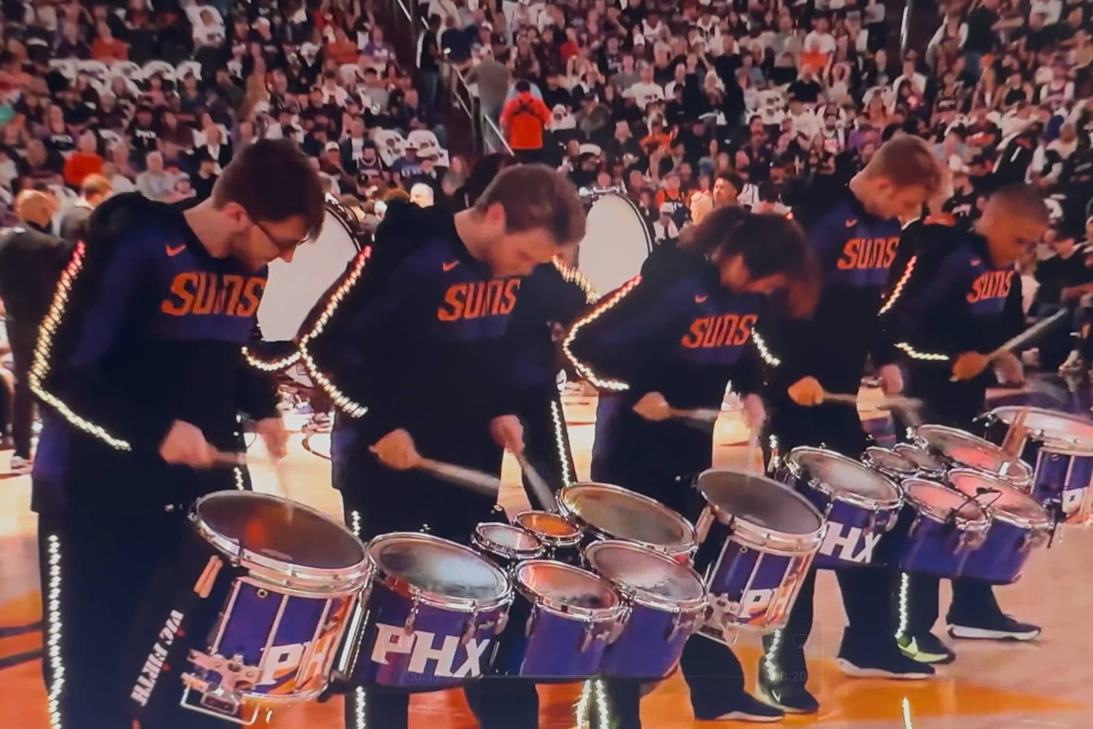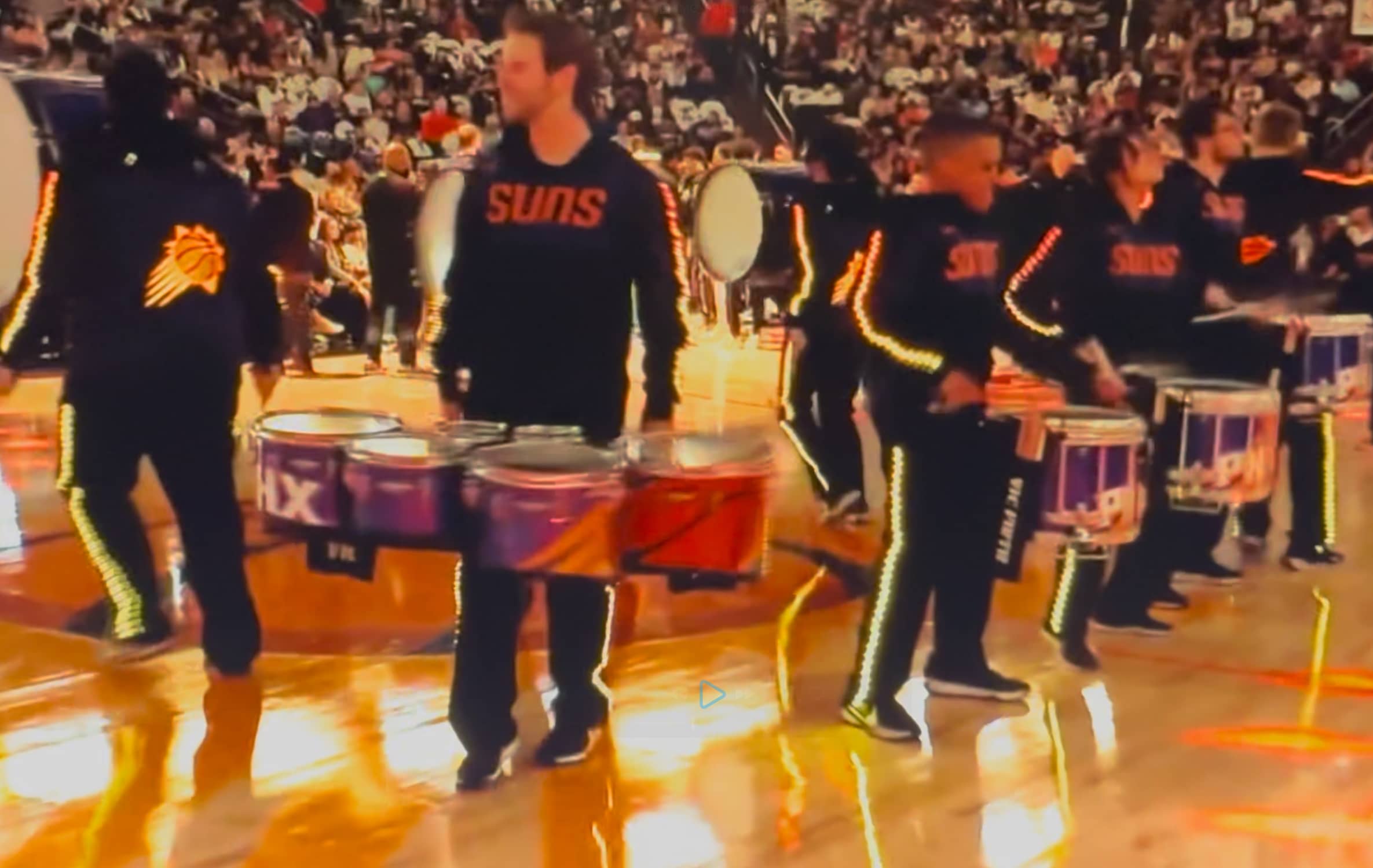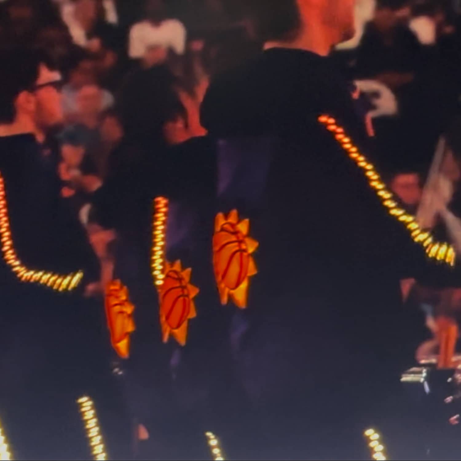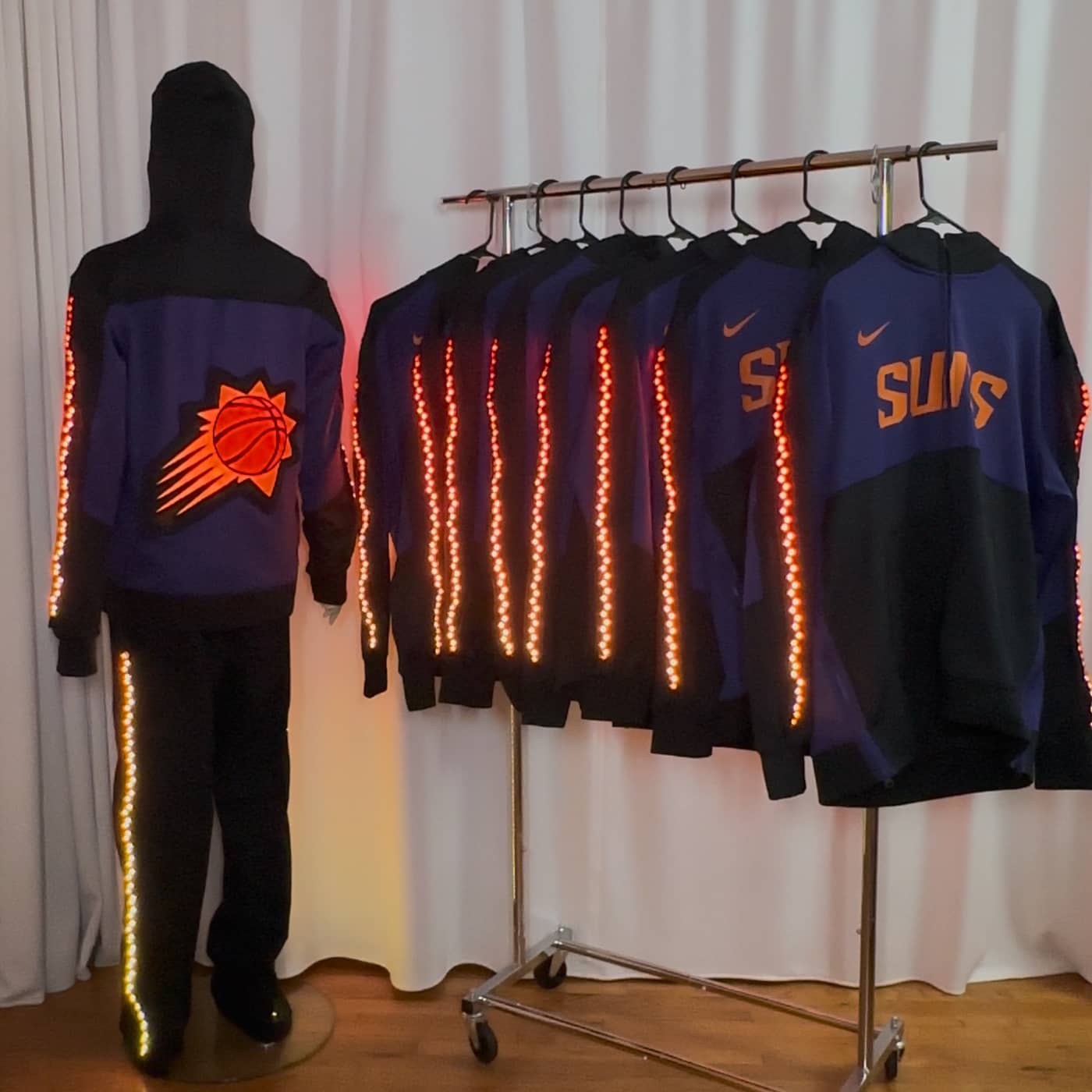 We were commissioned to light up warm up suits for PHX Beats, the drumline that performs at Phoenix Suns NBA home games. We added stripes of lighting along the outer seams of the sleeves and legs, and created an illuminated logo for the back of each jacket.